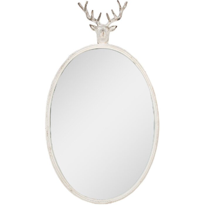 Oválne nástenné zrkadlo 50x10x89 cm, starožitne biele, s dekorom hlavy jeleňa, zo železa a skla, rustikálny šarm pre vidiecke a vintage izby