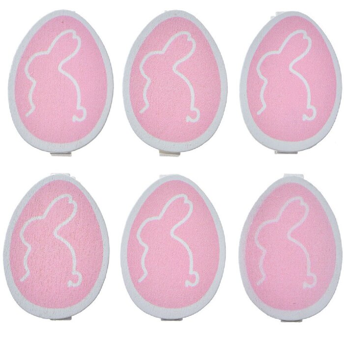 Sada 6 ružových drevených klipov v tvare vajíčka, veľkosť 3x1x5 cm, ideálne na veľkonočné dekorácie, pohľadnice alebo darčeky, s roztomilou siluetou zajačika