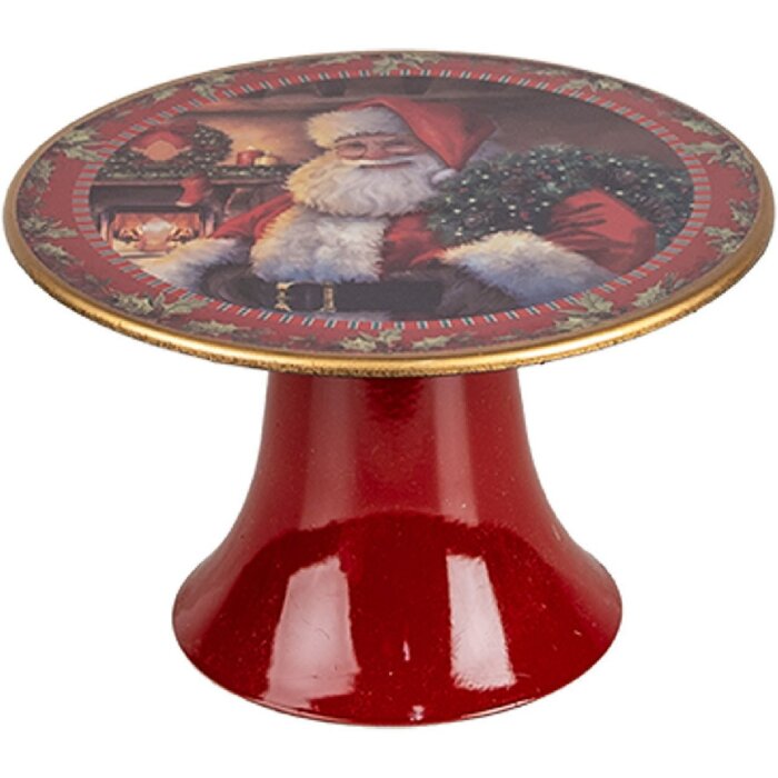 Slávnostný tanier na tortu od Clayre & Eef, Ø 16x10 cm, plastový, červeno-biely s nostalgickým motívom Santa, ideálny na torty a zákusky, vianočný vidiecky štýl