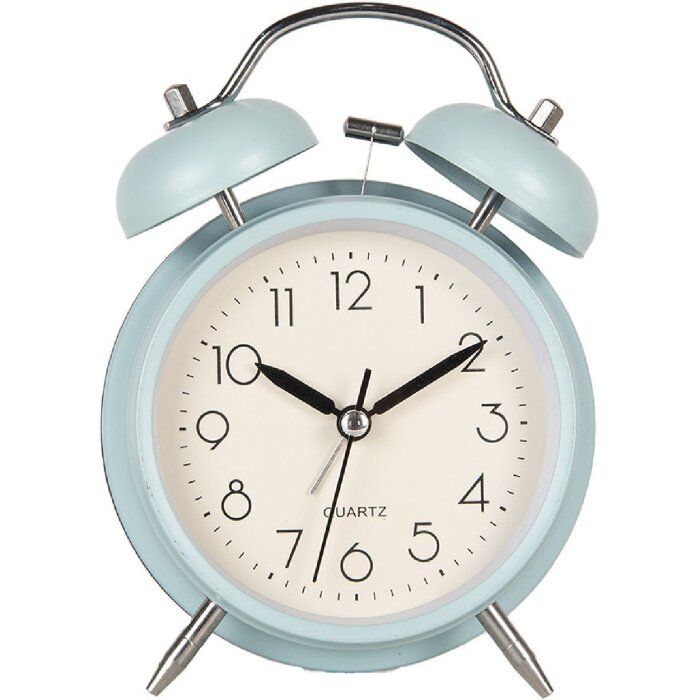 Analógový budík z kovu v modrej farbe, klasický dizajn s modernými akcentmi, presný quartzový strojček, hlasné zvonenie, 12x6x17 cm, funguje na 1x AA batériu