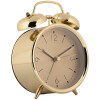 Elegantný analógový budík, zlatá farba, moderný dizajn, rozmery 10x6x14 cm, materiál kov a sklo, vyžaduje 1x batériu AA, ideálny do spálne alebo kancelárie