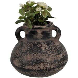Dekoratívny kvetináč od Clayre & Eef, Ø 15x13 cm, keramika, sivá farba, vidiecky štýl, detailný kvetinový vzor, dve držadlá, ideálny pre malé až stredne veľké rastliny, pevný a odolný