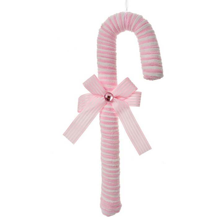 Vianočný prívesok cukrová trstina ružovo-biela, 12x4x36?cm, v štýle vidieckeho domu, s mašľou a trblietavým kameňom, z plastu