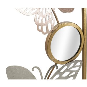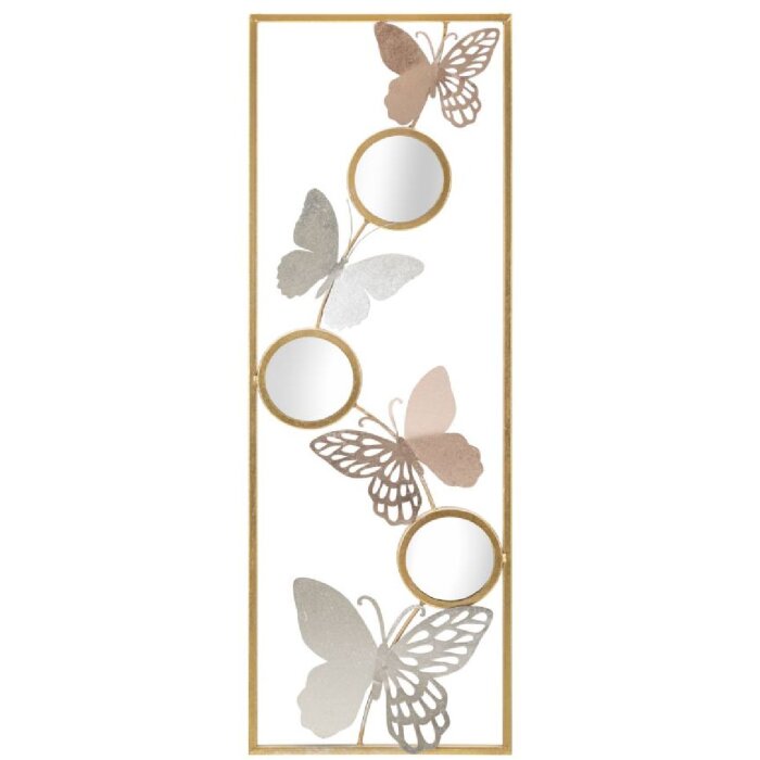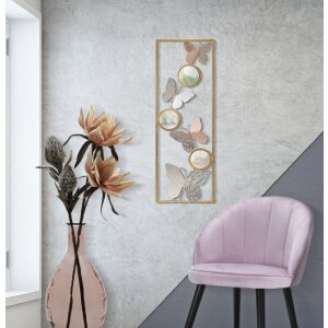 Nástenný panel 31x2x90 cm, železo a zrkadlo, zlatá farba s farebnými motýľmi, 3 zrkadlá, 3D efekt, vertikálny a elegantný pre úzke plochy stien