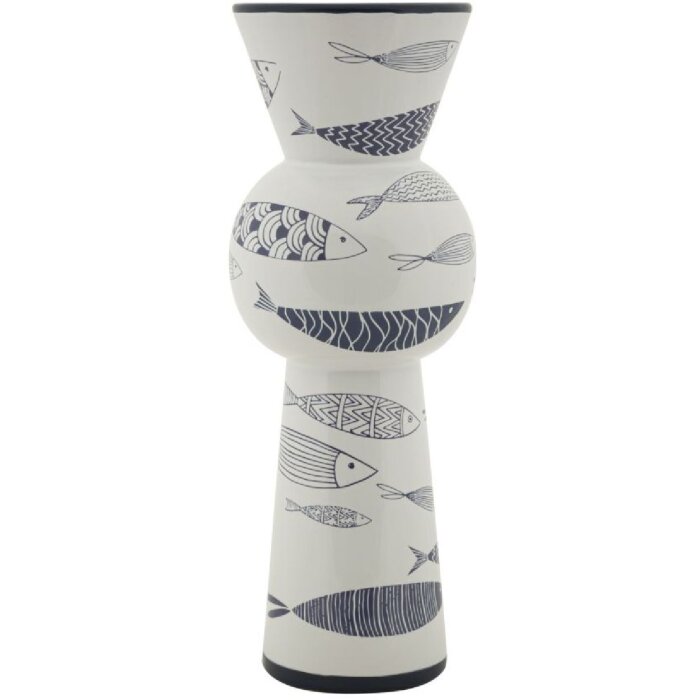 Keramická váza Ø?14x38,5?cm, bielo-modrá, námorný dizajn so štylizovanými rybami, ideálna na vetvy alebo ako dekorácia pre milovníkov mora