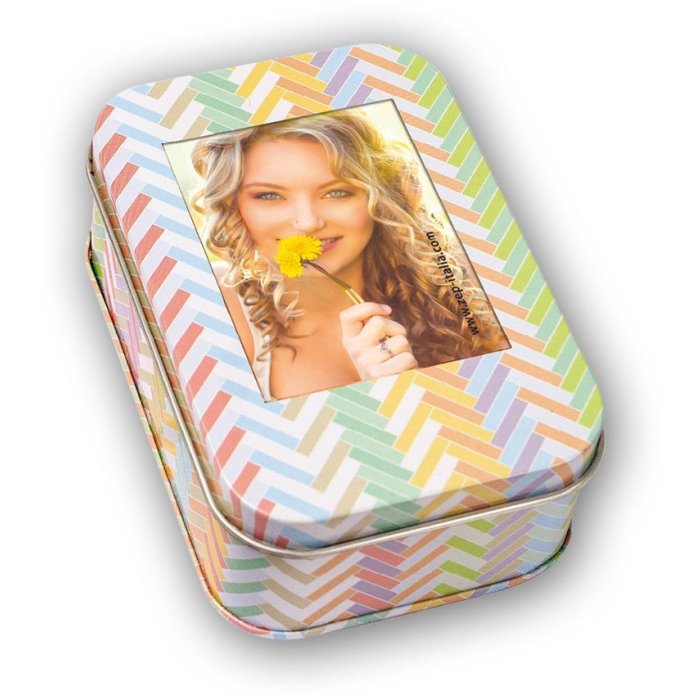 Kovová škatuľa s rámom na obraz, priestor vo veku na fotografiu 4x6 cm