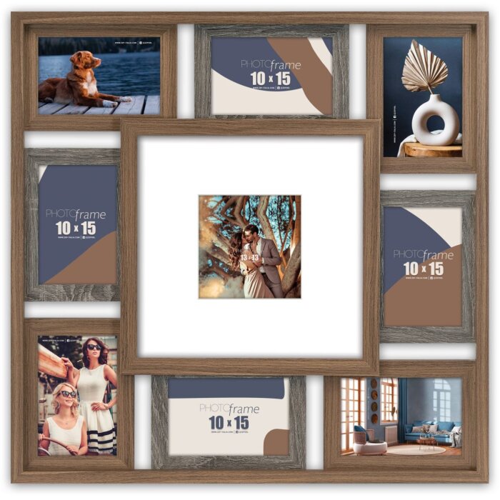 ZEP MDF rám na fotografie vo vzhľade dreva, rám na 8 fotografií 10x15 cm a jednu fotografiu 13x13 cm alebo 27x27 cm, na montáž na stenu