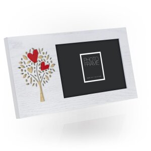 Drevený portrétny rám ZEP, zdobený stromčekom a srdiečkami, na fotografiu 10x15 cm vo formáte na šírku, ktorý sa postaví na výšku